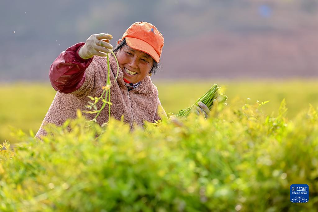 2月17日,浙江省杭州市淳安县千岛湖镇坪山生态浮岛上,工作人员忙着采摘水生蔬菜。