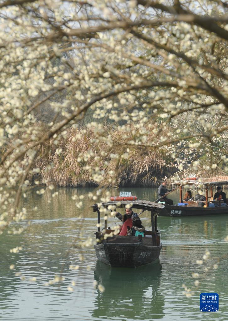 2月18日,游客在西溪湿地乘船赏梅。