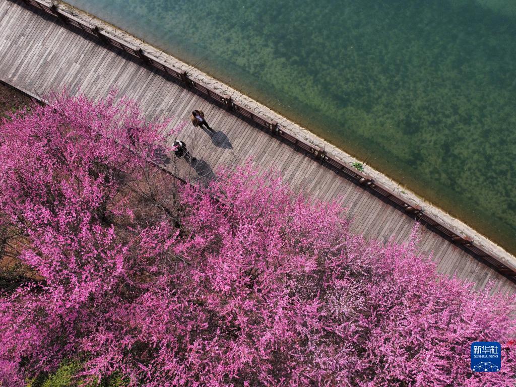 2月19日,居民在贵州省施秉县河滨公园赏花漫步(无人机照片)。