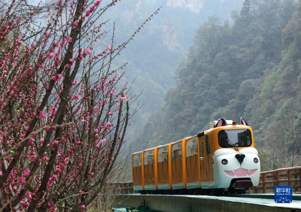 2月19日,游人乘坐十里画廊观光电车在湖南张家界国家森林公园游玩。