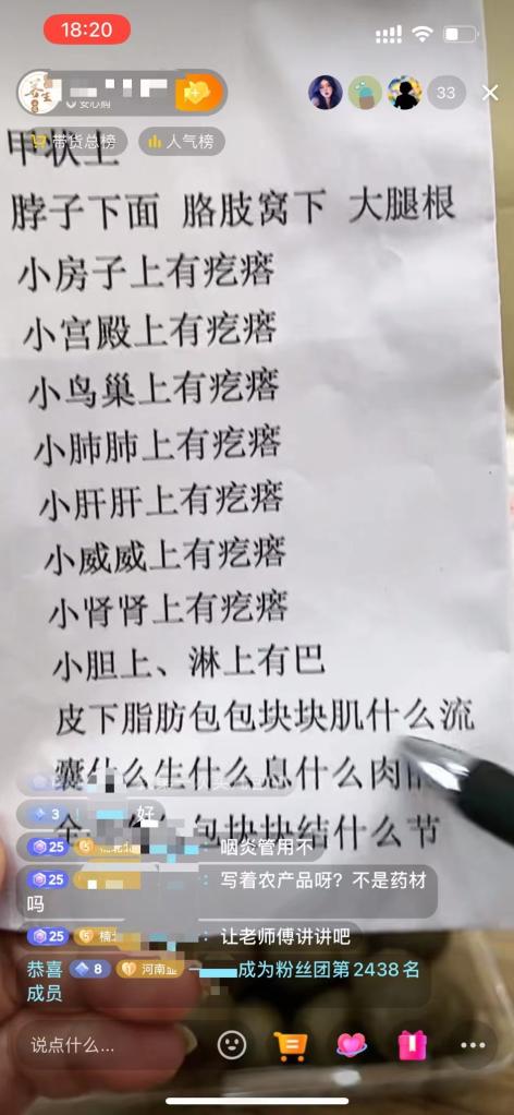 经过一段时间观察后记者发现,主播提及的“囊什么肿”等“奇怪”的词汇,实际上都是医药类术语:囊肿、息肉、结节、甲状腺、汤药等,之所以这样说,目的是为了躲避平台的违禁词审查。