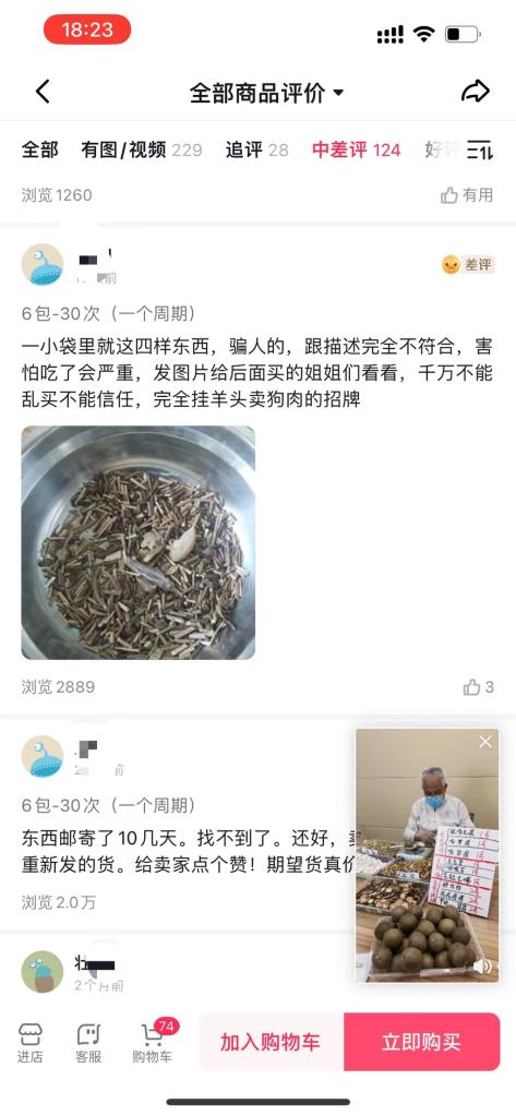 而在该款“散结汤”的详情页中,中差评达到数百条,有消费者写道:“喝了一段时间,啥效果也没有,病情严重的千万别乱买”“在药房里买同样的东西,比这里便宜好几倍”“打开一包,还混杂着一根生锈的钉子”……