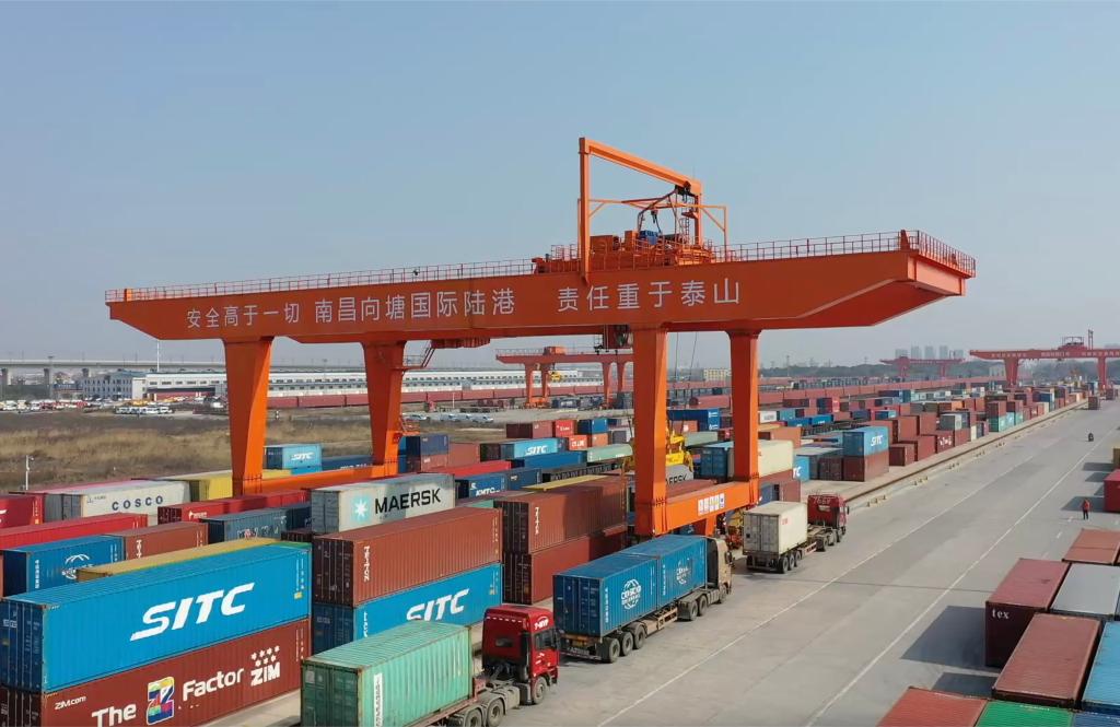 春日渐暖,走进南昌向塘国际陆港,吊车来回装卸货物,集装箱整齐地码在铁轨两旁,它们即将搭乘火车奔向海外。