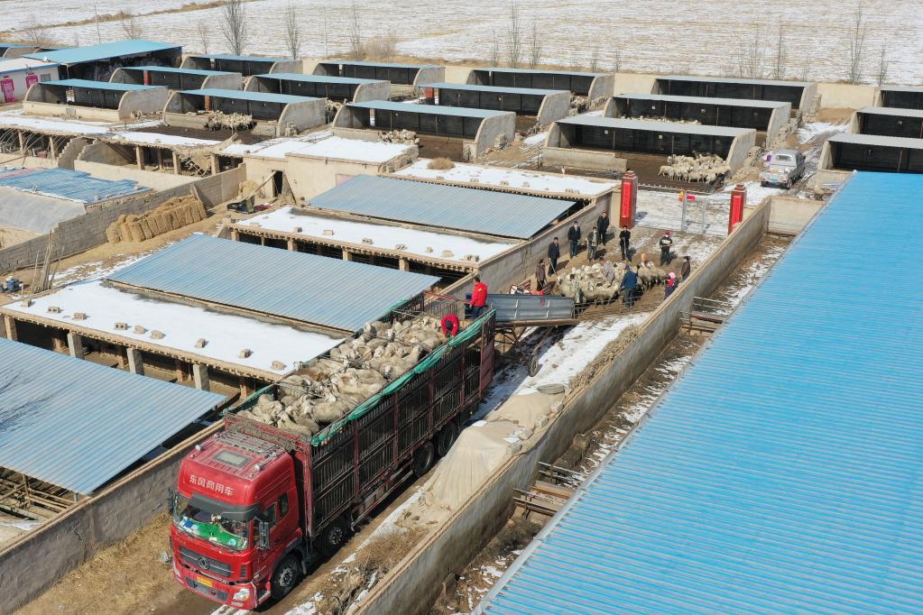 2月15日,在甘肃省武威市古浪县黄花滩镇黄花滩村,村民出售的肉羊被装车。新华社记者 范培珅 摄