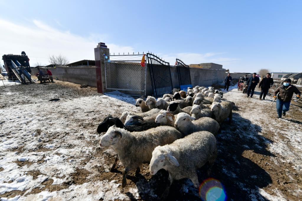 这是2月15日在甘肃省武威市古浪县黄花滩镇黄花滩村,村民将出售的肉羊赶出养殖圈舍。新华社记者 范培珅 摄
