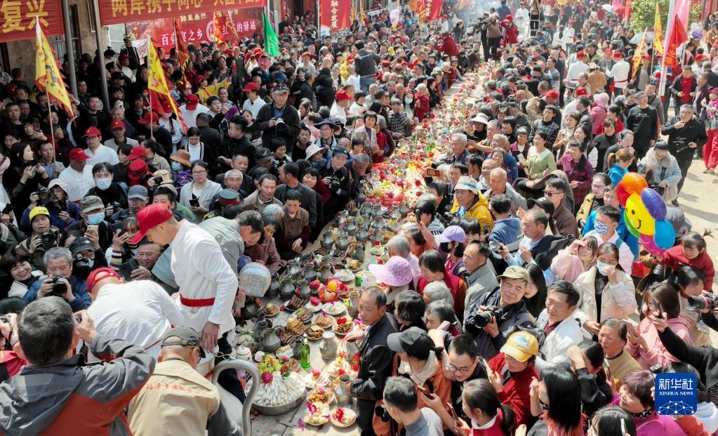 2月21日,在福建省龙岩市长汀县濯田镇升平村,村民们参加“百壶宴”民俗活动(无人机照片)。