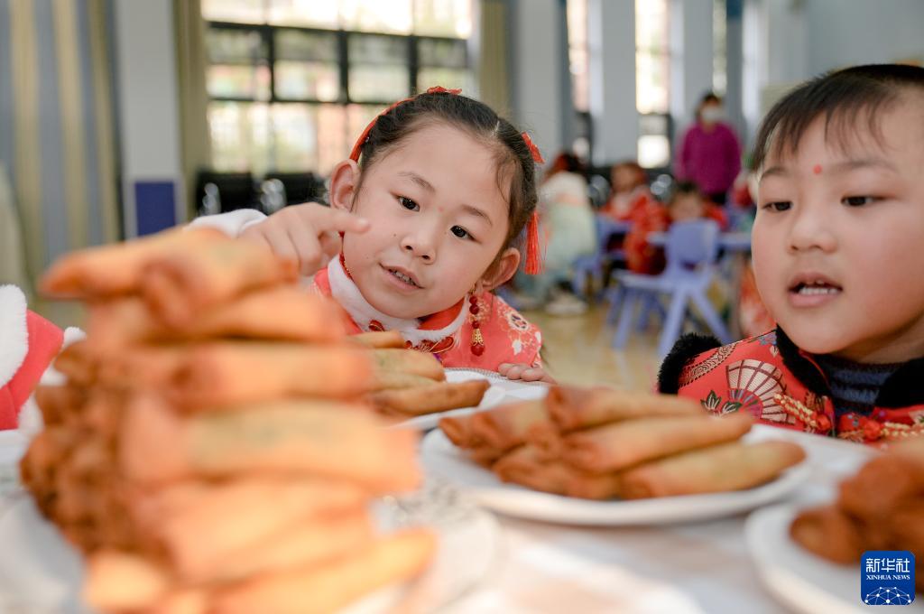 2月21日,安徽省合肥市蜀山区南岗镇惠民新村幼儿园的小朋友们参加“吃龙鳞”活动。