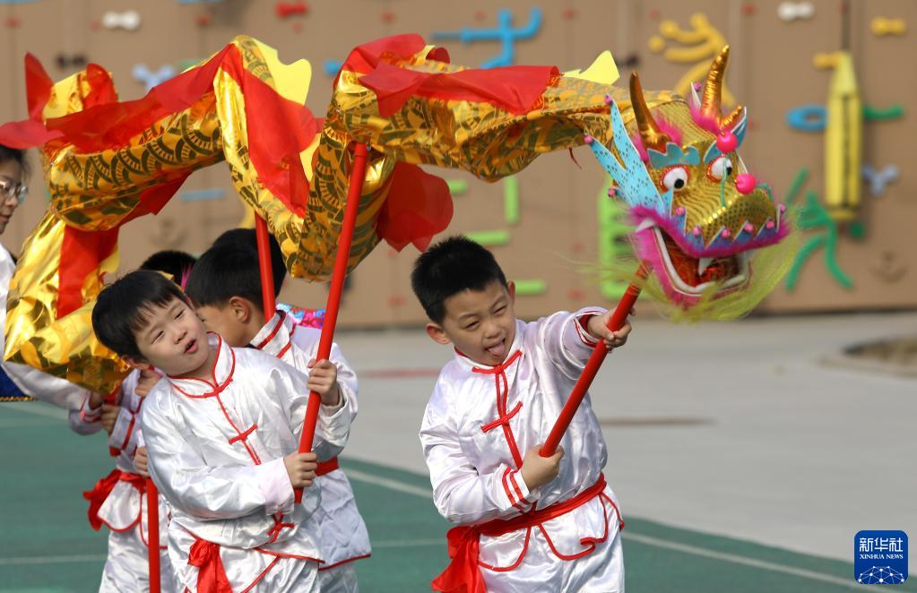 2月21日,在河北省石家庄市井陉矿区天护幼儿园,小朋友们在“二月二 龙抬头”主题活动中表演舞龙。