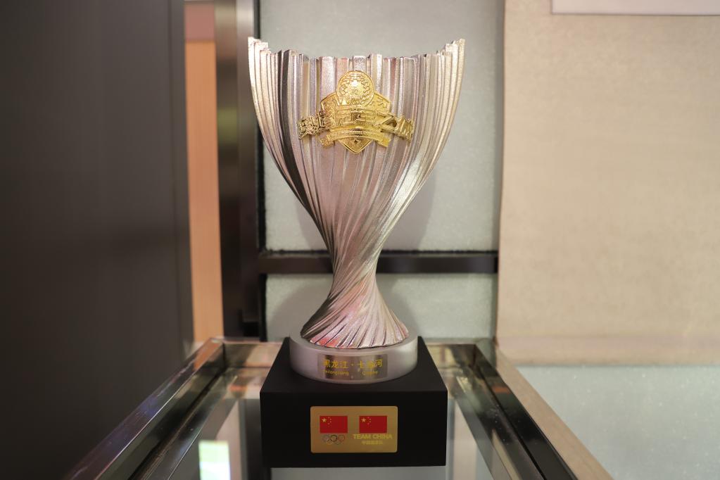 七台河短道速滑冠军馆内的“奥运冠军之城”奖杯。新华社记者 戴锦镕 摄