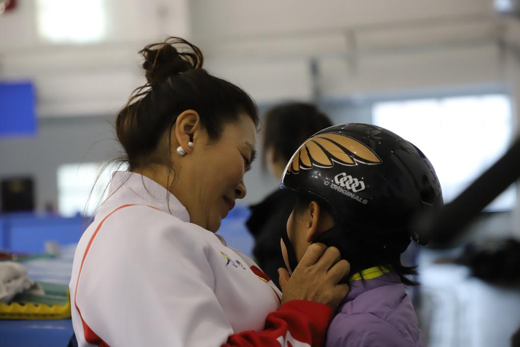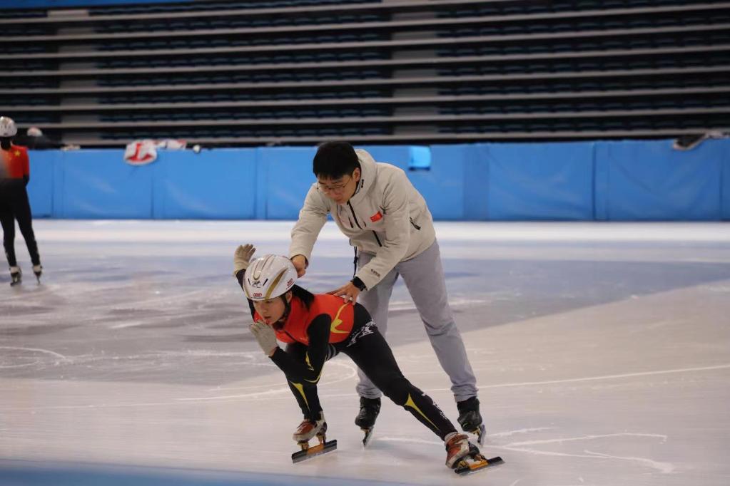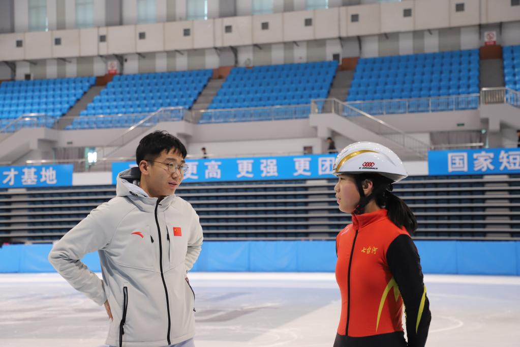 2月7日,在七台河体育中心,刘厶函(左)在教练李国锋(右)的指导下练习短道速滑。新华社记者 戴锦镕 摄