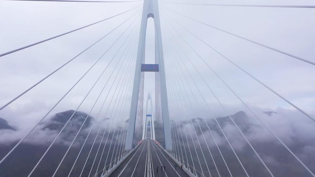 2019年建成通车的平塘特大桥,全长2135米,桥面宽30.2米,桥面距河面高差300米,主跨跨度达550米。桥塔采用钻石形设计,主塔高达332米,相当于110层楼高,是世界最高的混凝土桥,也被誉为最美的“天空之桥”。