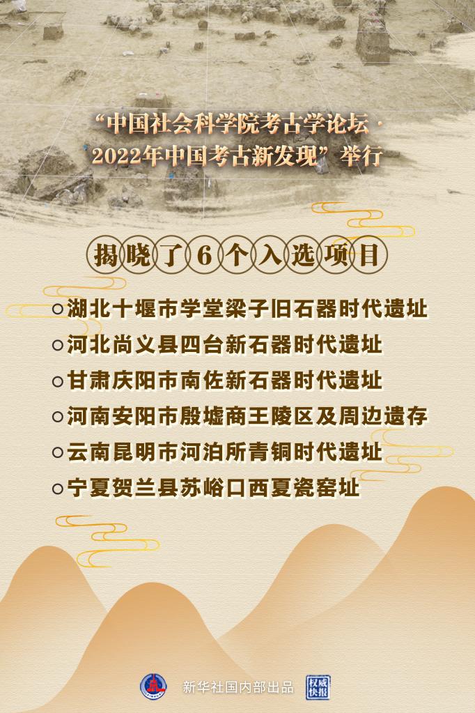 由中国社会科学院主办,中国社会科学院考古研究所等承办的“中国社会科学院考古学论坛·2022年中国考古新发现”22日在京举行。湖北十堰市学堂梁子(郧县人)旧石器时代遗址、河北尚义县四台新石器时代遗址、甘肃庆阳市南佐新石器时代遗址、河南安阳市殷墟商王陵区及周边遗存、云南昆明市河泊所青铜时代遗址、宁夏贺兰县苏峪口西夏瓷窑址等6个考古项目入选“2022年中国考古新发现”。