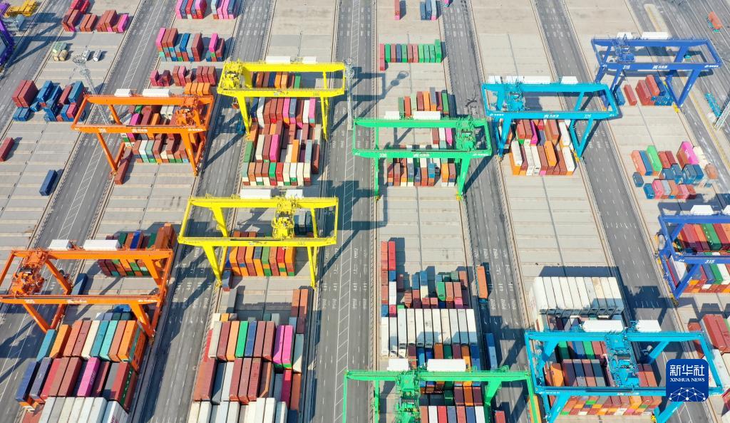在天津港全物联网集装箱码头,场桥在堆场内吊运集装箱(无人机照片,2月21日摄)。