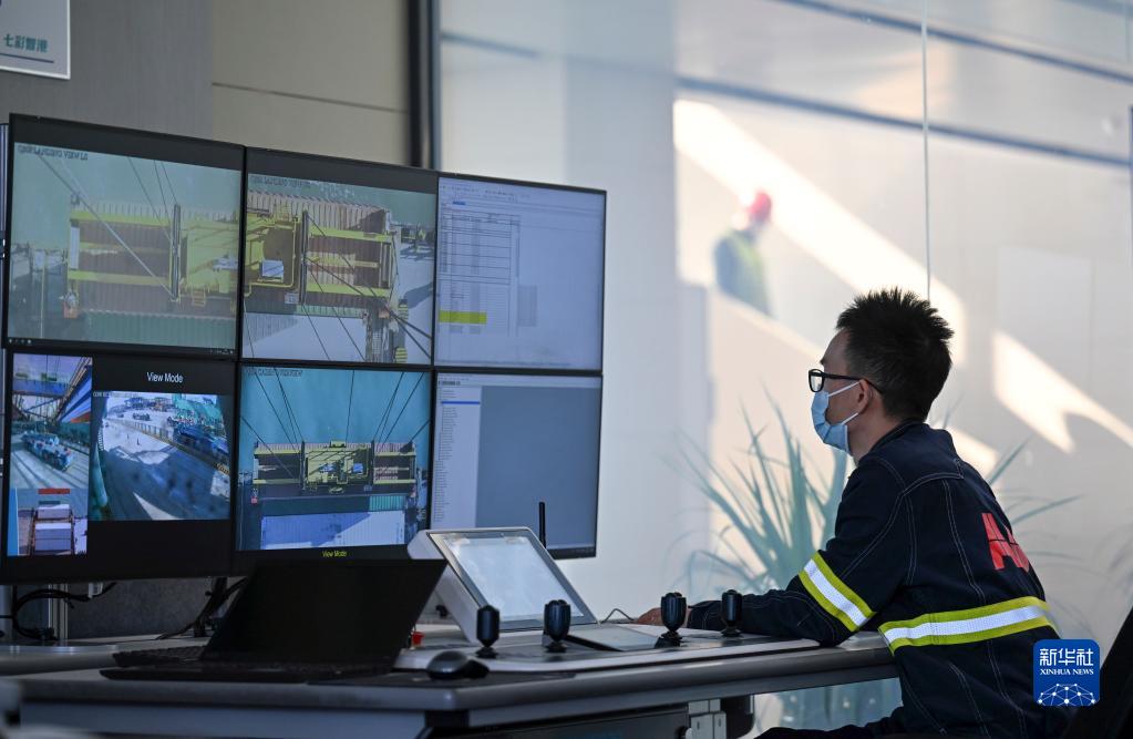 工作人员在天津港全物联网集装箱码头技术中心调试设备(2月21日摄)。