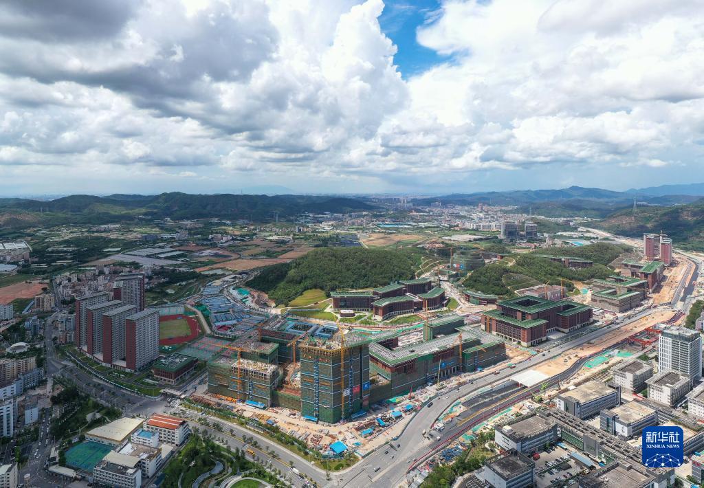 这是2021年5月26日拍摄的中山大学深圳校区“中大城”已经启用的一期西园和二期建设现场(无人机照片)。广深科技创新走廊“中大城”是集科研、创新、生态于一体的区域教育高地、医疗高地和创新高地,以生物医药产业、新一代信息技术产业和先进制造业为主导产业。新华社记者 刘大伟 摄