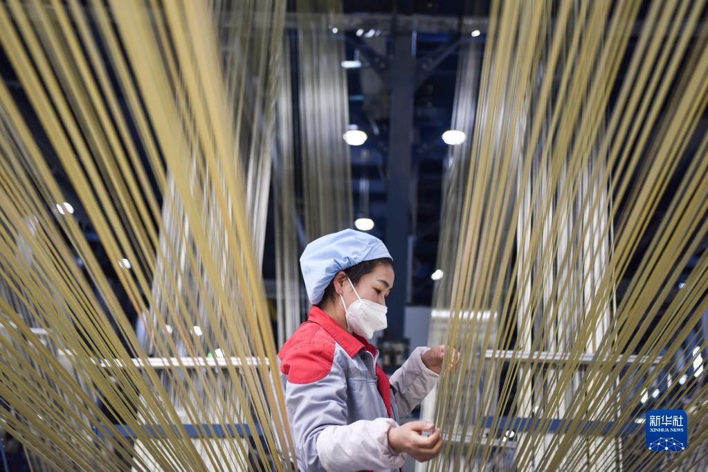 2月22日,在中复神鹰碳纤维西宁有限公司,工作人员在整理碳纤维原丝。