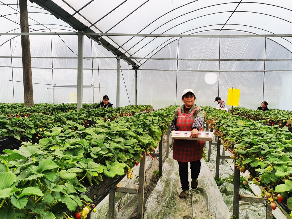 2月8日,工人在泗渡农场大棚里采摘草莓。新华社记者 郑明鸿 摄