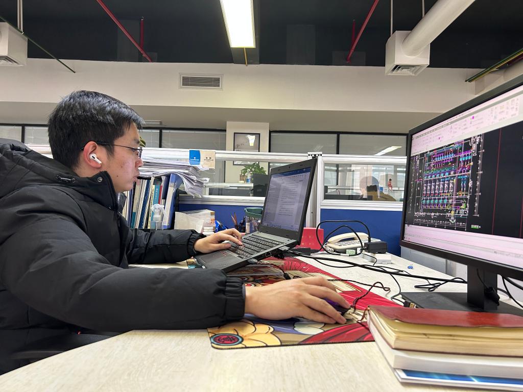 2月17日,张翀正在为江苏启东一工业建筑高效机房制定调试方案。新华社记者张璇 摄