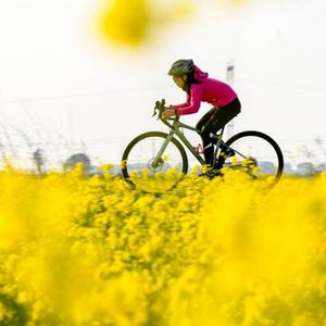 图为2月21日,骑行爱好者在江西省樟树市永泰镇官湖村油菜花海中骑行、赏花。(周亮 摄)