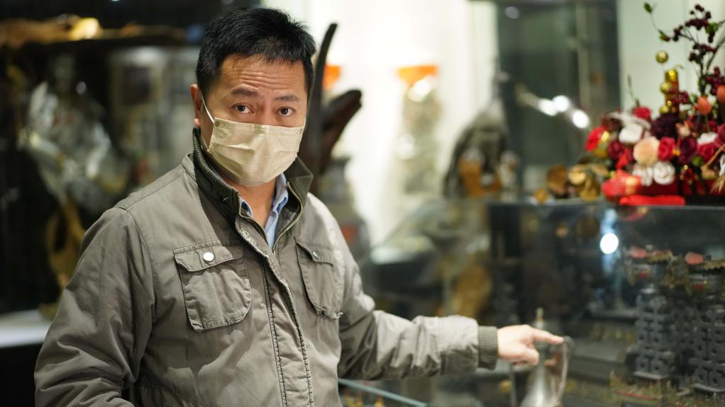 锡艺匠人陈志升介绍家族成员们制作的锡器(2月4日摄)。新华社记者 黄扬 摄
