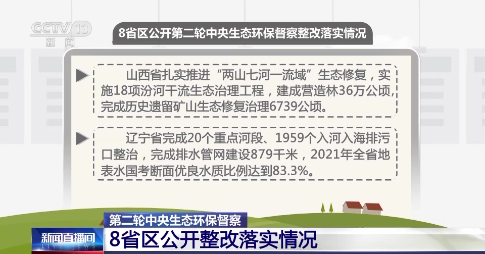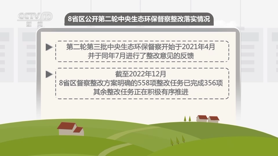 第二轮第三批中央生态环保督察开始于2021年4月,并于同年7月进行了整改意见的反馈。截至2022年12月,8省区督察整改方案明确的558项整改任务已完成356项,其余整改任务正在积极有序推进。