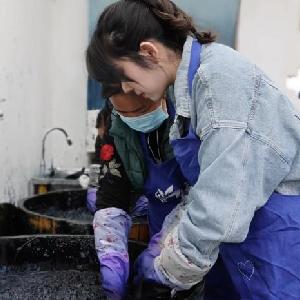 游客在大理市蓝续喜洲田园店体验扎染。新华社记者 曾维 摄