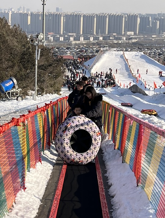 在太原市玉泉山景区,游客们排队体验冰雪项目(2月4日摄)。 新华社记者 王皓 摄