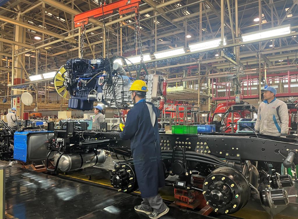在山西大运集团重卡总装车间里,工人们正忙得热火朝天。流水线上,两三名工人每5分钟完成一个装配步骤,经过28道工序后,一辆崭新的重型卡车就成功下线。