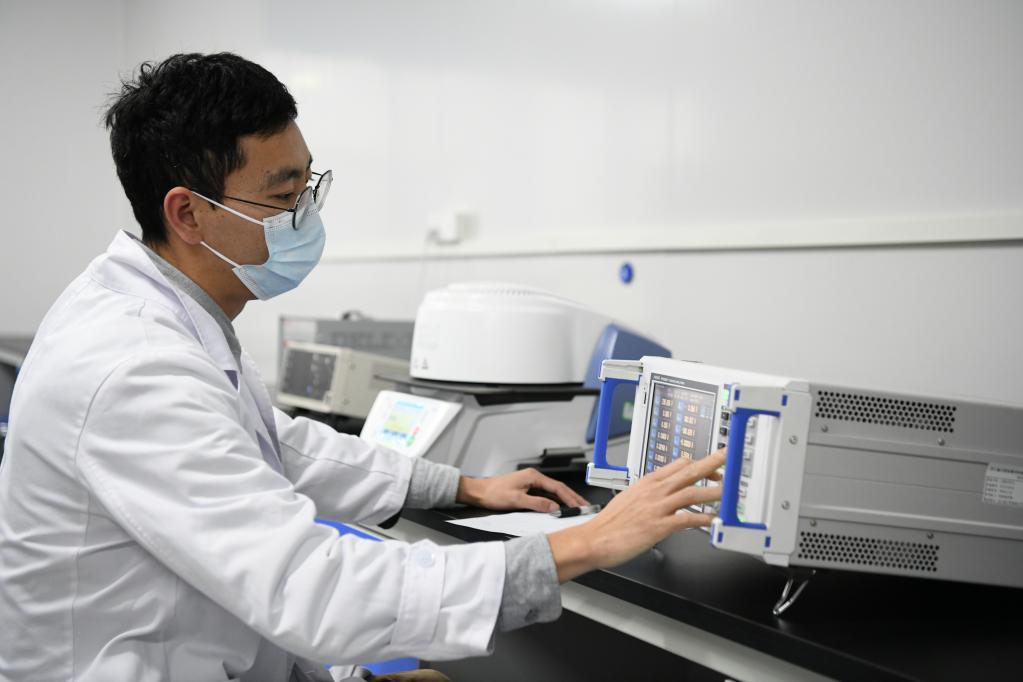 在四川省口腔装备材料检验检测中心内,工作人员正在检验产品。新华社记者 唐文豪 摄