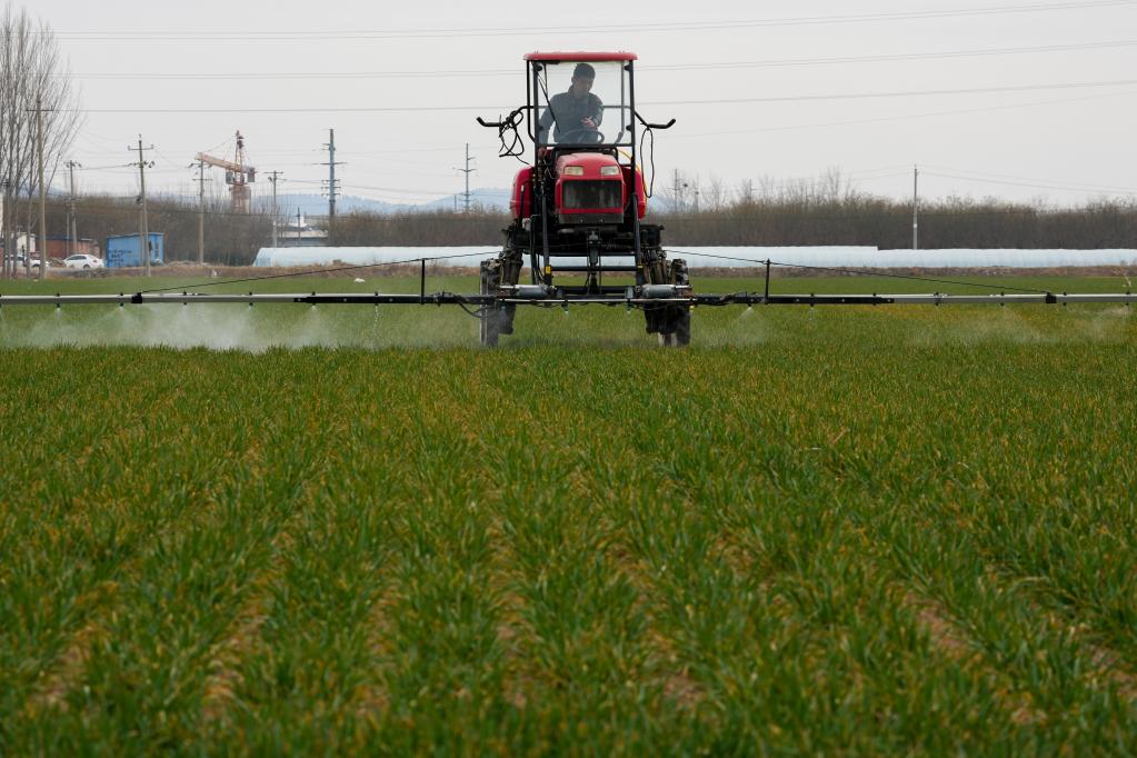 2月22日,山东省嘉祥县龙腾农机作业服务专业合作社机手驾驶植保机为麦田施肥。新华社记者 朱峥 摄