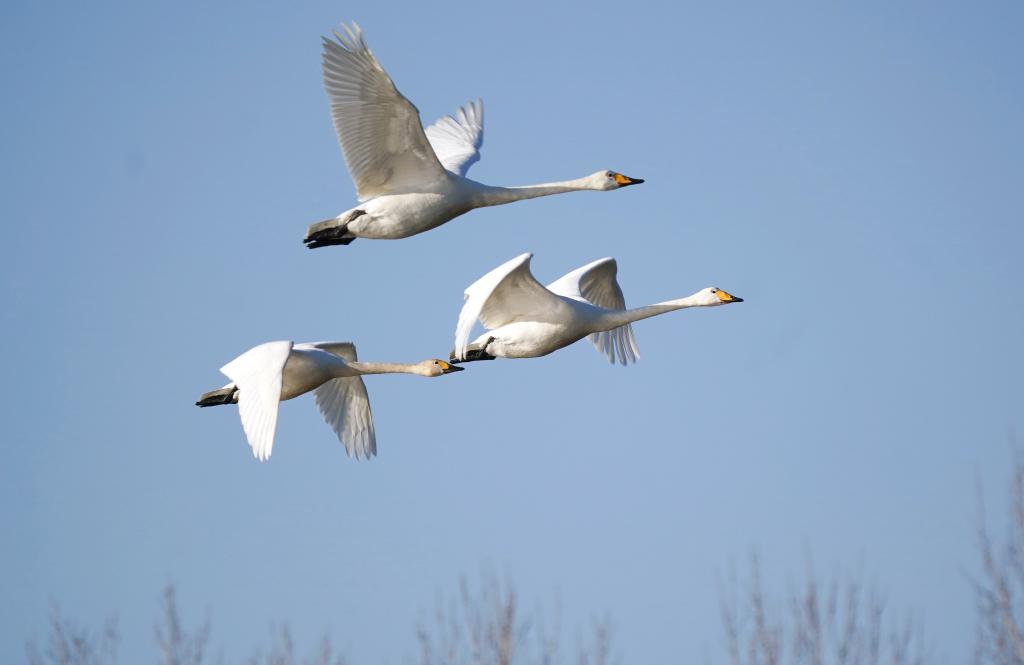 2月25日,天鹅在曹妃甸湿地上空飞翔。