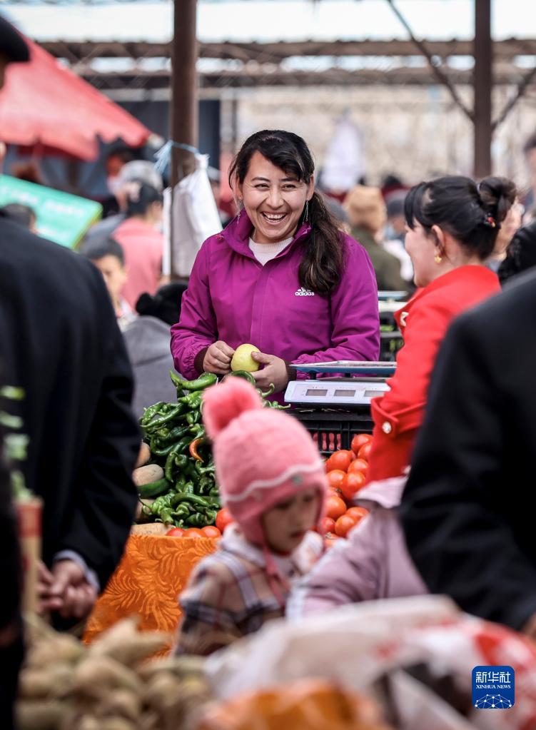 2月26日,在托克扎克镇农贸市场,蔬菜商贩和顾客交流。