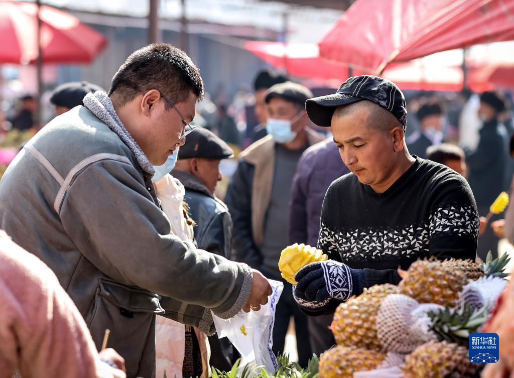 2月26日,在托克扎克镇农贸市场,顾客在购买菠萝。