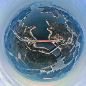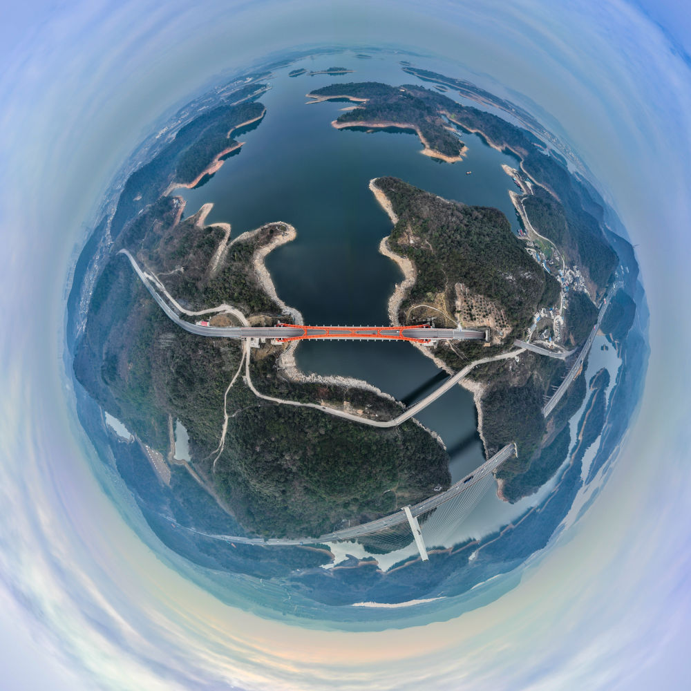 在卫星和无人机的技术赋能之下,贵州桥梁的气势得以充分展现。但是新的问题又出现了,传统的平面图片和视频缺乏与终端受众的互动感,也无法全角度体现出贵州桥梁与周围环境和谐共生的关系。基于这样的思考,我们拍摄VR图片并在客户端上制作出VR互动页面,受众手指点入VR场景即可以全角度、互动式观看贵州桥梁。在VR视角之下,座座高桥宛如纽带,跨越深邃的峡谷、沟壑,将纵横的群山紧密相连。