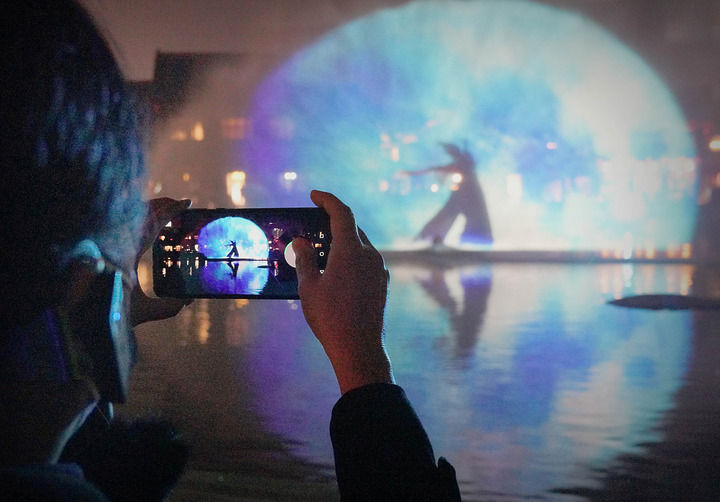 游客在洛阳市洛邑古城内观看水幕电影(2月22日摄)。新华社记者 李安 摄