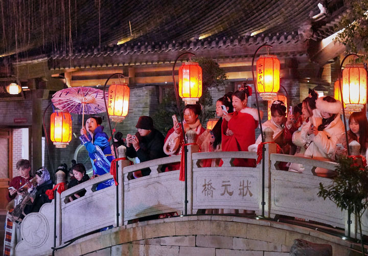 游客在洛阳市洛邑古城内游玩拍照(2月22日摄)。新华社记者 李安 摄