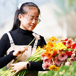位于沂蒙革命老区的莒县招贤镇扶郎花生产基地,工作人员在整理扶郎花。