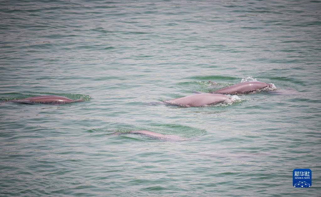 在湖北省宜昌市,长江江豚在水中嬉戏(2021年5月11日摄)。