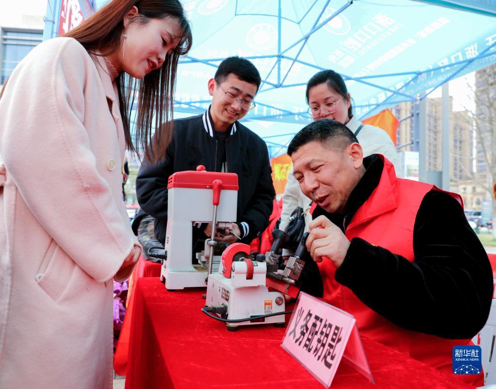 2月28日,在长兴县和文化广场上,雉城街道社工志愿者给市民免费配钥匙。