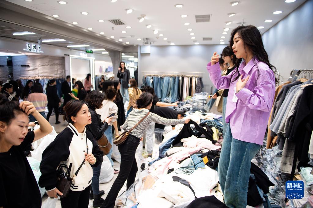 2月28日,模特(右一)在湖南省株洲市芦淞区华丽服装批发大市场向批发商展示服饰。