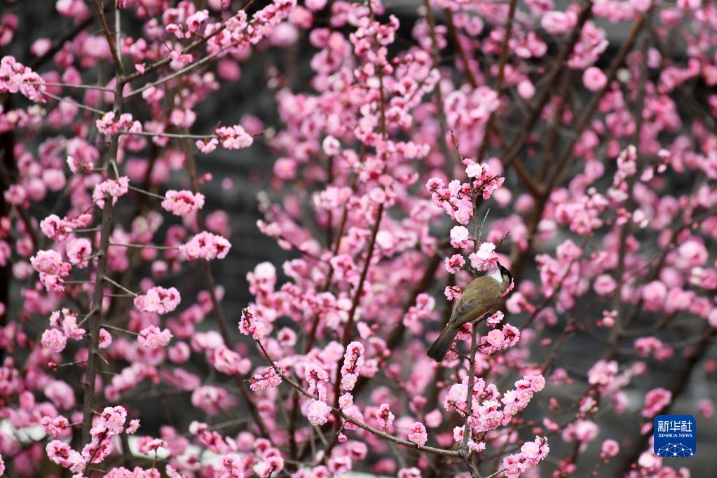 春回大地,万物复苏。鸟儿在花丛中觅食休憩,一派生机勃勃的春日景象。
