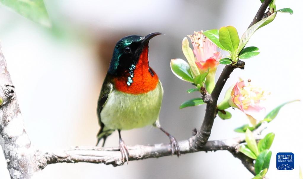 2月27日,在四川省达州市通川区大寨子公园,一只太阳鸟在花枝上停歇。