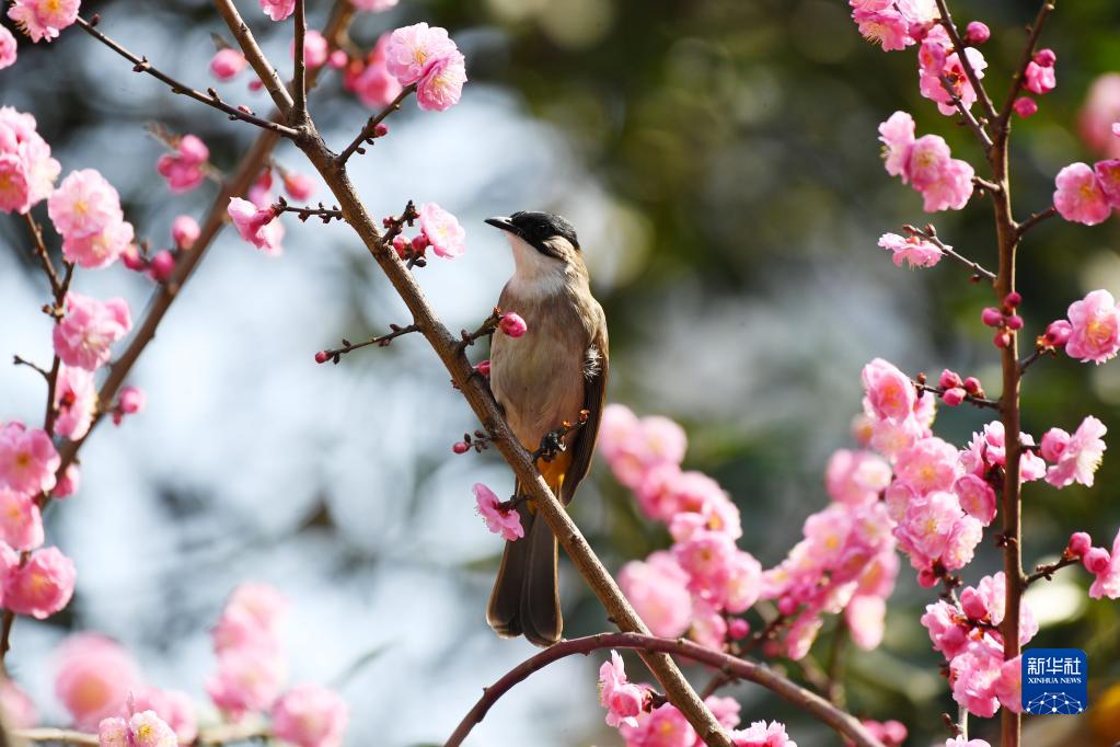 2月27日,小鸟在贵州省仁怀市街边的梅花枝头停歇。