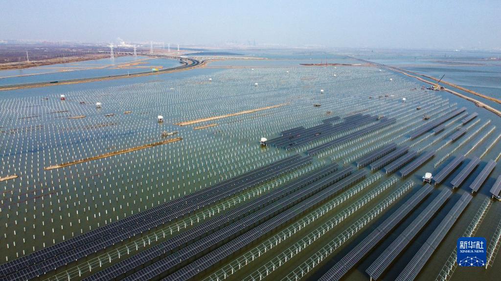 2月7日拍摄的建设中的天津滨海新区龙源海晶盐光互补项目(无人机照片)。新华社记者 孙凡越 摄