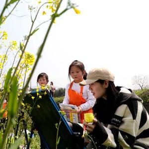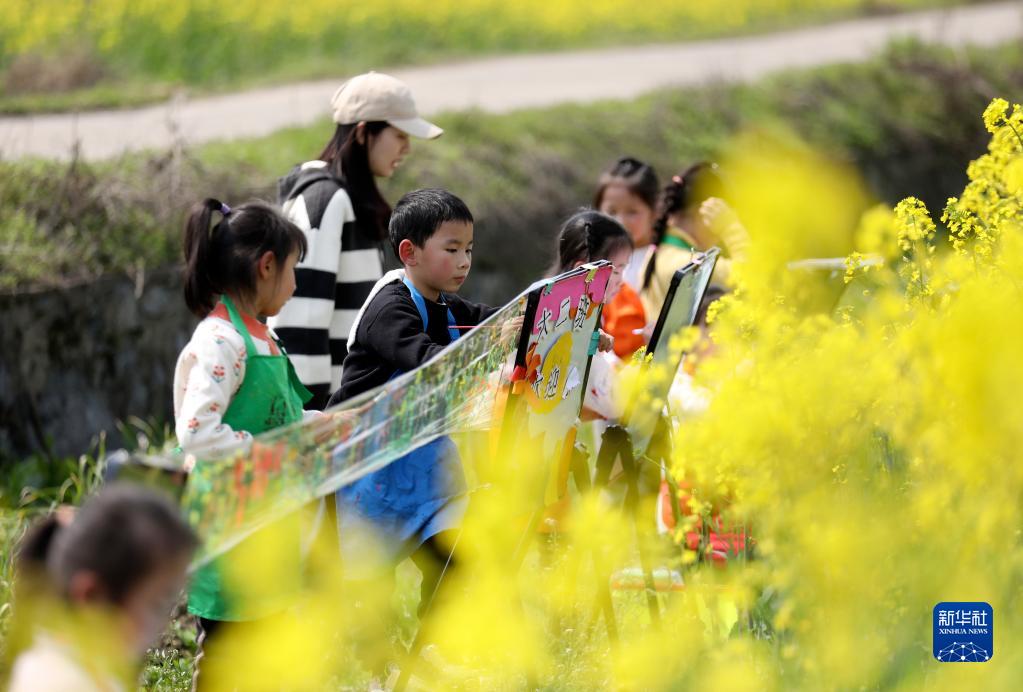 2月28日,在湖南省资兴市唐洞街道高码村,小朋友在油菜花田旁画画。