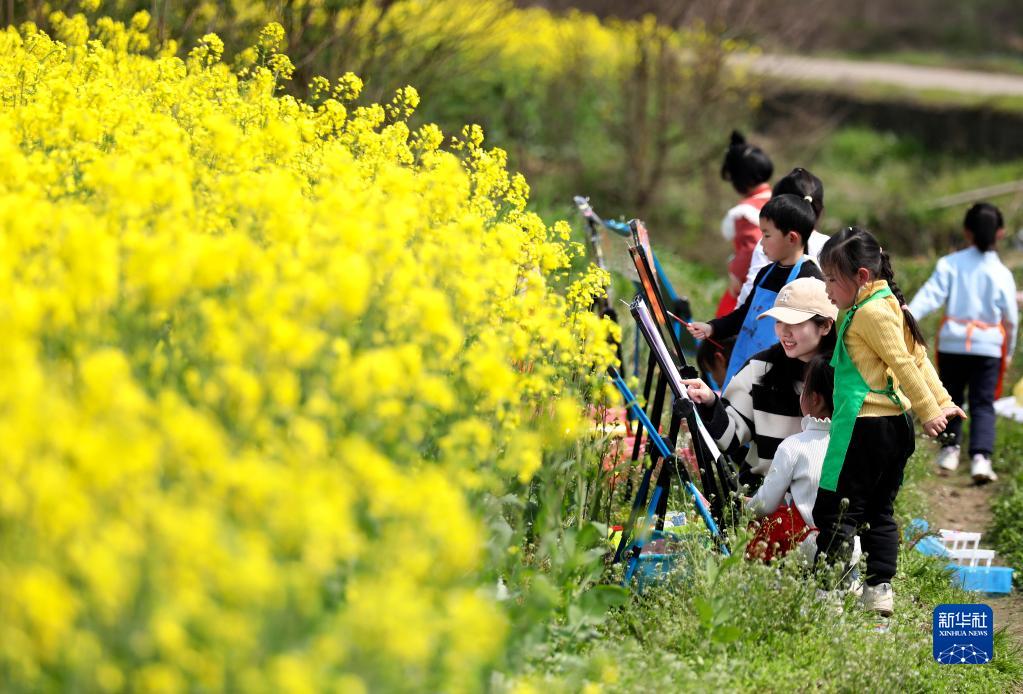 2月28日,在湖南省资兴市唐洞街道高码村,老师指导小朋友在油菜花田旁画画。