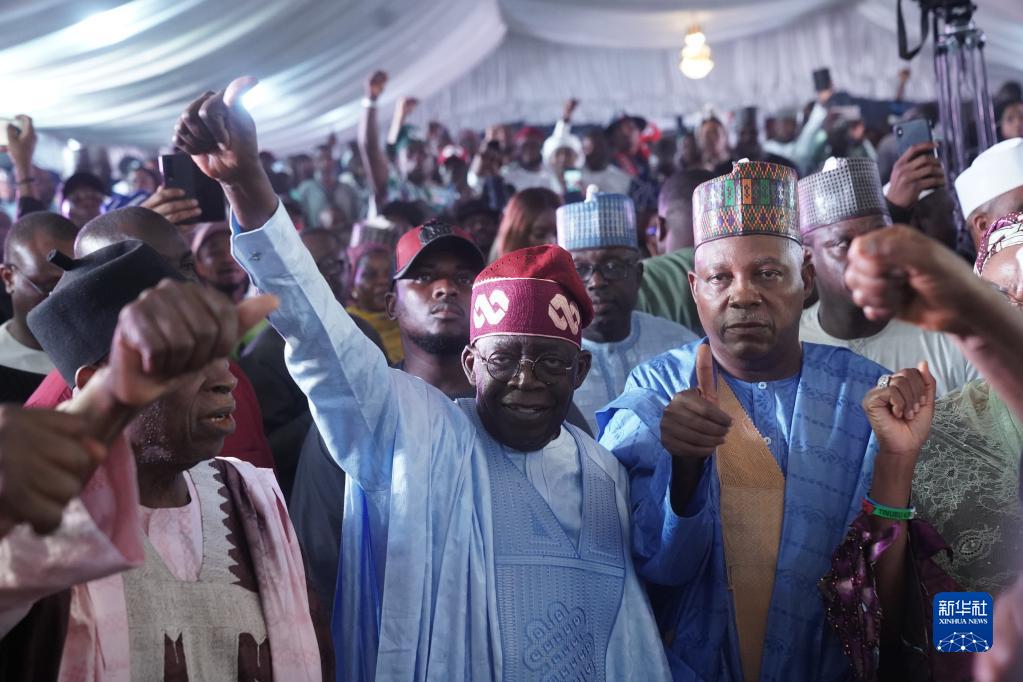 3月1日,在尼日利亚首都阿布贾,尼日利亚当选总统博拉·蒂努布(前中)与支持者一道庆祝胜选。新华社发(埃马·奥索蒂 摄)