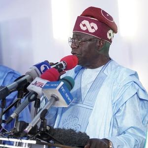 3月1日,在尼日利亚首都阿布贾,尼日利亚当选总统博拉·蒂努布(中)发表胜选讲话。新华社发(埃马·奥索蒂 摄)