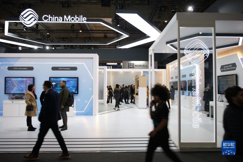 这是3月1日在西班牙巴塞罗那拍摄的世界移动通信大会上的中国移动展台。新华社记者 孟鼎博 摄