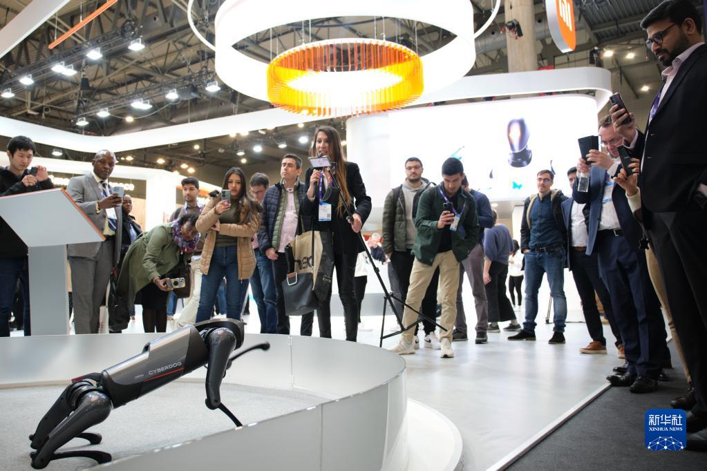 3月1日,在西班牙巴塞罗那,人们在世界移动通信大会上参观小米机器狗Cyberdog。新华社记者 孟鼎博 摄